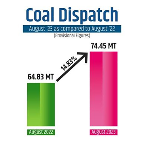 Additionally, Coal dispatch witnessed a significant boost in August 2023, reaching an impressive 74.45 MT, showcasing notable progress compared to the 64.83 MT recorded in August 2022, with a growth rate of 14.83%.