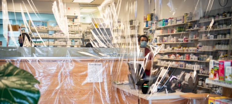 Photo caption and credit: UN Photo/Evan Schneider A view of a pharmacy through protective plastic in Astoria, Queens, during the COVID-19 outbreak in New York City.