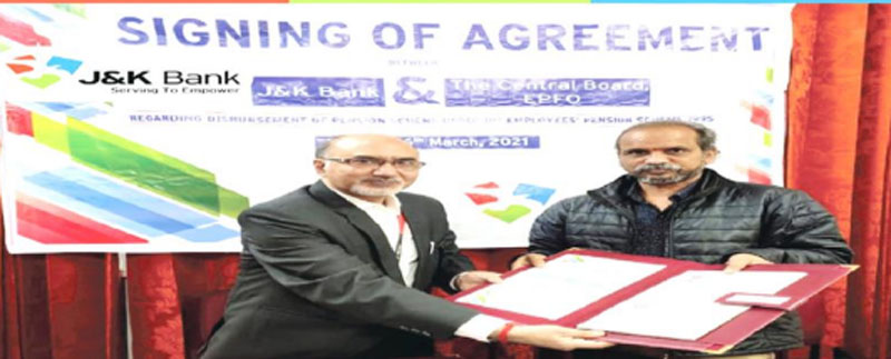 Srinagar: Jammu and Kashmir Bank has entered into an agreement with the Central Board of Trustees of Employees’ Provident Fund Organization (EPFO), according to which the Bank has been appointed as agent for the purpose of disbursement of pension under the Employees’ Pension Scheme 1995.
