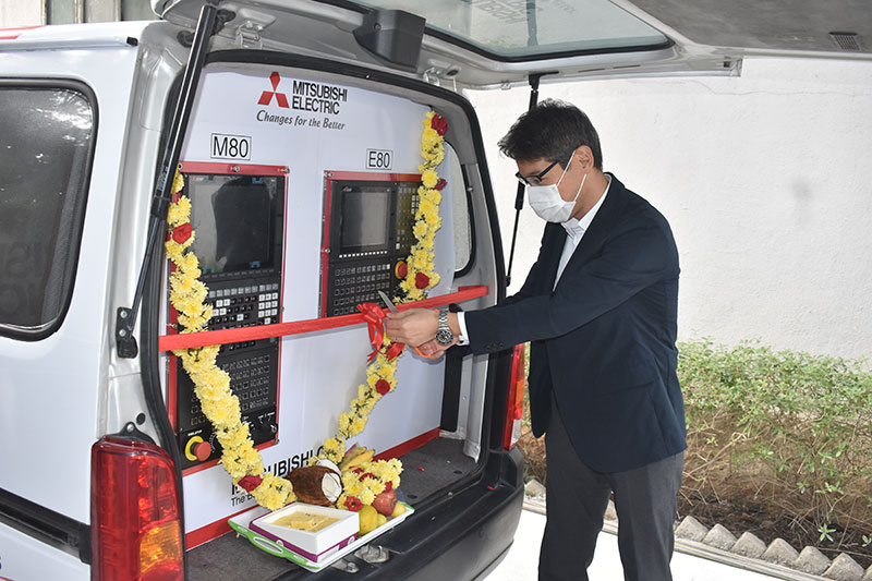 The “CNC-on-Wheels” consists of two major CNC controls: M80, which is our flagship product and E80, which is a product with limited features, aimed at SMSe/MSMEs. The initiative is designed in a way that a qualified engineer of Mitsubishi Electric will always be present during the whole journey of the vehicle in the industrial areas which will lead to numerous benefits such as sharing knowledge of operations, applications, troubleshooting, explanation of specific features etc. which will be explained to the users.