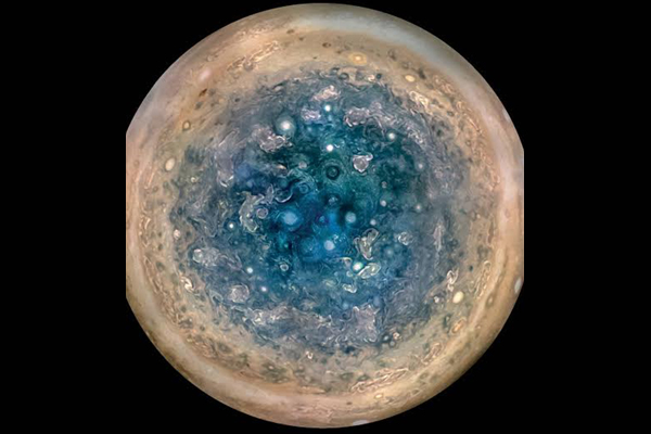 Among the findings that challenge assumptions are those provided by Juno’s imager, JunoCam. The images show both of Jupiter's poles are covered in Earth-sized swirling storms that are densely clustered and rubbing together.