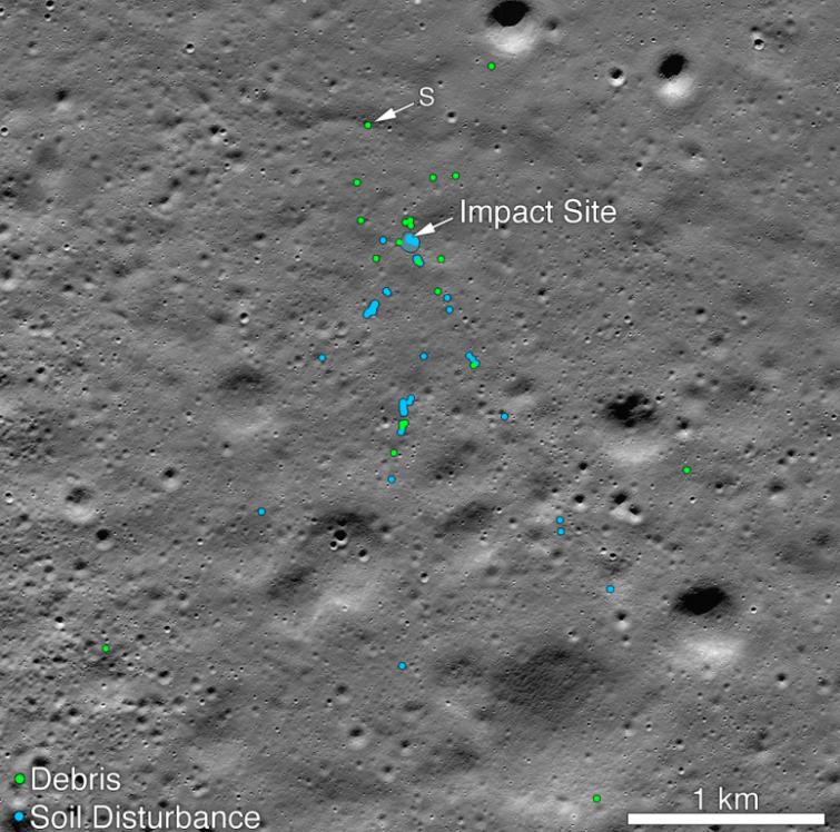 The LROC team scoured the surrounding area in these new mosaics and found the impact site (70.8810°S, 22.7840°E, 834 m elevation) and associated debris field.