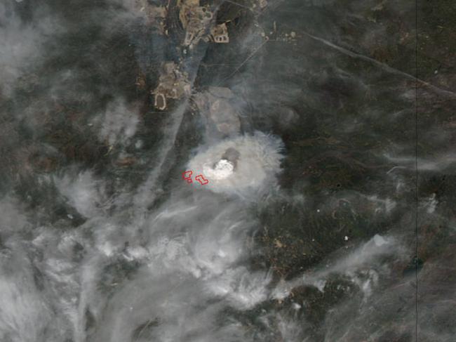 The image shows the area almost completely obliterated by the clouds of smoke rising from the fire. The smoke released by any type of fire (forest, brush, crop, structure, tires, waste or wood burning) is a mixture of particles and chemicals produced by incomplete burning of carbon-containing materials. All smoke contains carbon monoxide, carbon dioxide and particulate matter (PM or soot). Smoke can contain many different chemicals, including aldehydes, acid gases, sulfur dioxide, nitrogen oxides, polycyclic aromatic hydrocarbons (PAHs), benzene, toluene, styrene, metals and dioxins.