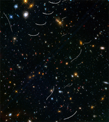 Intruding across the picture are asteroid trails that appear as curved or S-shaped streaks. Rather than leaving one long trail, the asteroids appear in multiple Hubble exposures that have been combined into one image. Of the 20 total asteroid sightings for this field, seven are unique objects. Of these seven asteroids, only two were earlier identified. The others were too faint to be seen previously.