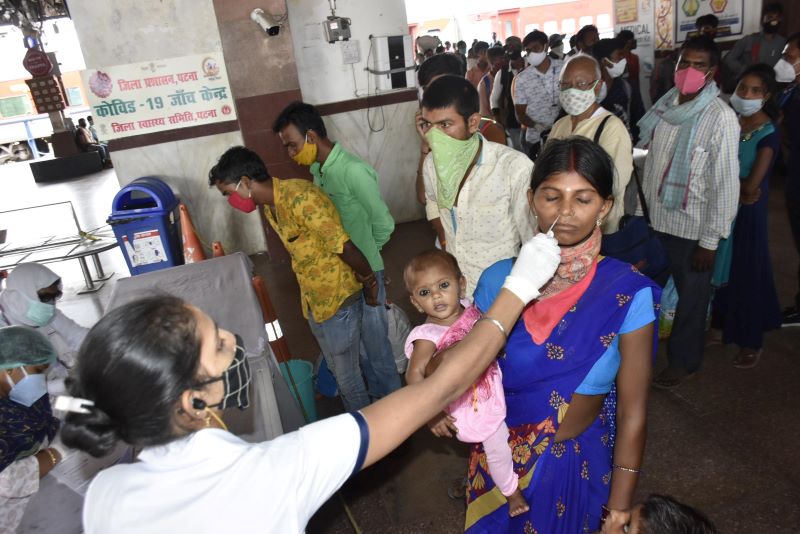 A health worker collects swab samples of migrant workers arrived from other states for COVID-19 test at Patna railway station on Tuesday (Image Credit: UNI)