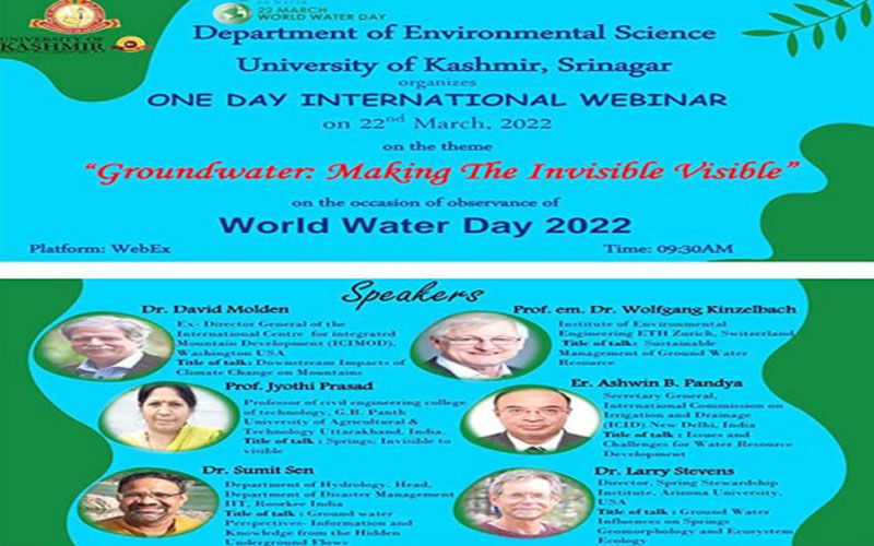 Srinagar: Several renowned scientists from different parts of the country and abroad on Tuesday joined an international webinar organised by the University of Kashmir to mark the World Water Day-2022 celebrations.