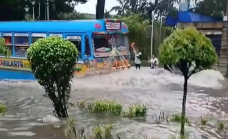 A private bus is submerged as heavy rain caused severe waterlogging in Kolkata. Photo: IBNS