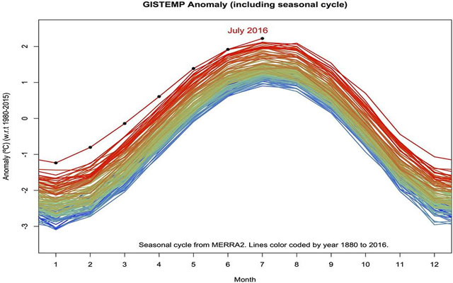 “It wasn’t by the widest of margins, but July 2016 was the warmest month since modern record keeping began in 1880,” said GISS Director Gavin Schmidt. “It appears almost a certainty that 2016 also will be the warmest year on record.”