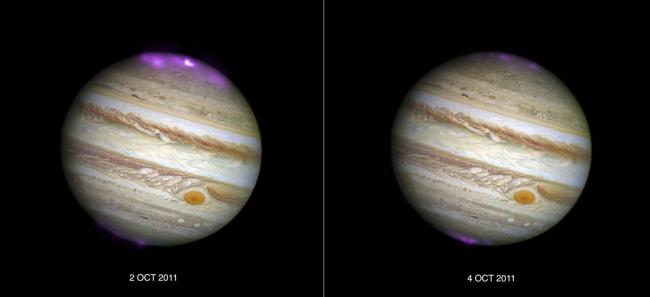 These composite images show Jupiter and its aurora during and after a CME's arrival at Jupiter in October 2011. In these images, X-ray data from Chandra (purple) have been overlaid on an optical image from the Hubble Space Telescope. The left-hand panel reveals the X-ray activity when the CME reached Jupiter, and the right-hand side is the view two days later after the CME subsided.