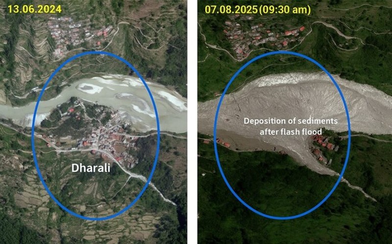 On August 7, two days after the disaster, the Indian Space Research Organisation’s National Remote Sensing Centre released images sourced through Cartosat-2S satellites. These images show the village before the disaster on June 13, 2024, and after the disaster on August 7, 2025. The images reveal the extent of damage in the Dharali market area following the flash flood.