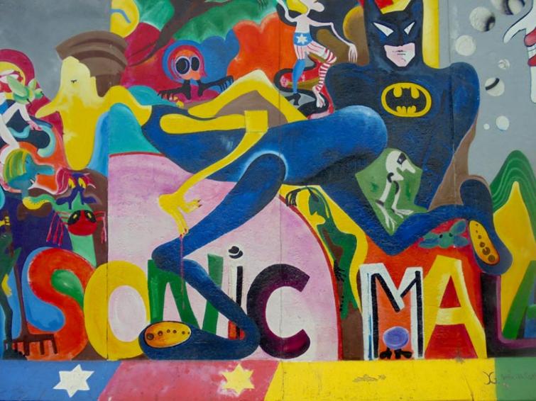The mural tilted Tolerance by Mary Mackey of USA highlights images of a rainbow population. She was the only American artist to be invited to be a part of the painting project in 1990. Mackey was also one of the artists invited to help restore the murals in 2009 which were depleting through wear and tear.
