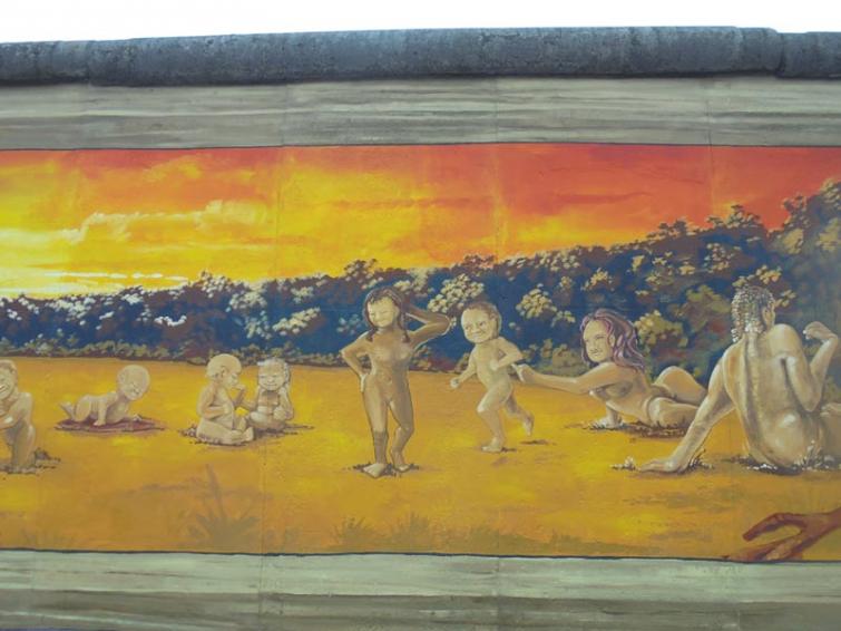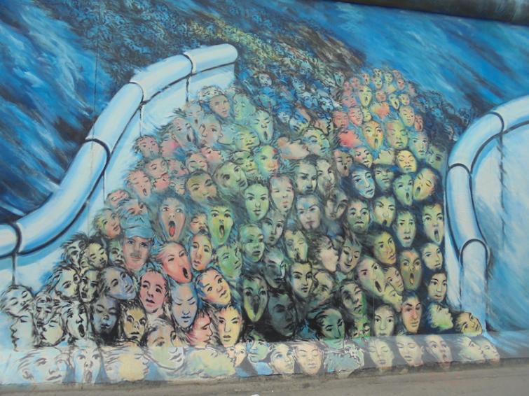 Exiled Iranian artist Kani Alavi has this mural titled It’s Happened in November with heads of many people as if emerging in a flood. Alavi came to Germany in 1980 from trouble-torn Iran. In an interview with DW, the German channel, when asked why artists, including him, painted the Berlin Wall he had said, “... it’s a document and we’re fighting to preserve it so that no one comes up with the idea of building another wall in Berlin.” Talking about the restrictions on Iranians travelling to the US imposed by President Donald Trump (2017), Alavi invited him to visit the East Side Gallery so that “ ...I can tell him why this wall in Berlin is still standing.”