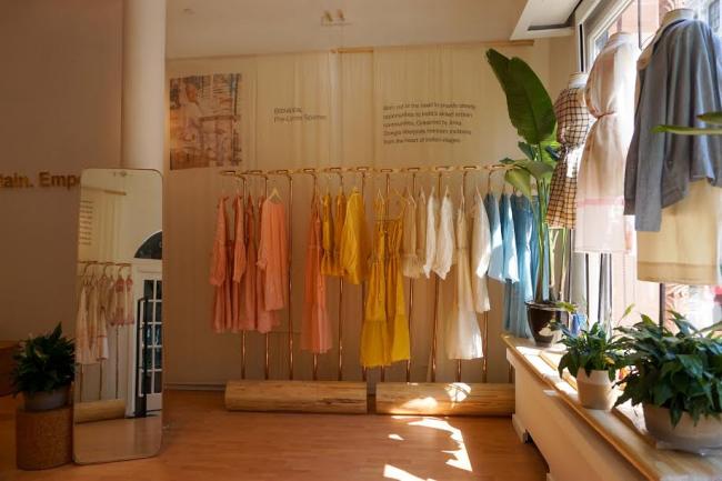 The space is bathed in natural light and accented by elements in rose gold, cork and recycled wood. Every detail is special in this store, from custom-made racks that give a nod to the humble shuttle (used to handweave fabric) and dreamy wall panels of handwoven chanderi and khadi that tell the journey of the brand.