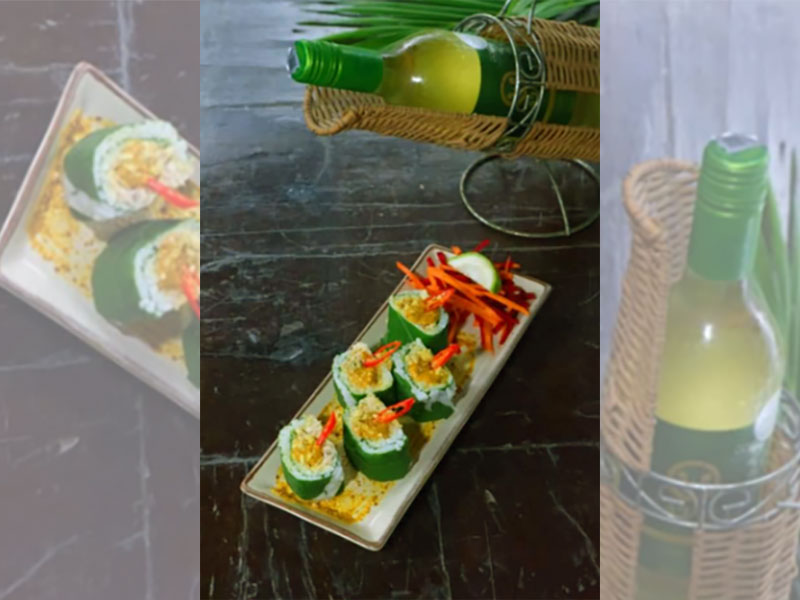 The boneless hilsa is steamed with salt and then kasundi, balsamic vinegar, black soya sauce, finely chopped red and green chili and a little bit of cheese are added, to make the hilsa filling for the sushi. Bottle gourd leaves are cleaned and slightly charred and then hilsa preparation is rolled in and steamed. After steaming it is cut into small pieces, garnished with red chilli and topped with steamed hilsa roe and drops of oil—leftover oil in which hilsa has been fried. When it gets served on an earthenware dish, it enhances your appetite. Ilish Gondhoraj Sushi’s are bite-sized packets of deliciousness! A sip of Fratelli Classic Merlot with it, perfects the pairing.