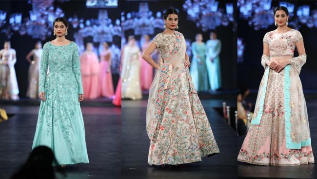 With special emphasis on embroidery, the silhouettes have been beautifully weaved in silks and nets with usage of multi-color resham mixed with other hand embroidery and intricate zardozi work, making each outfit look splendid and elegant, perfect for a summer bride.