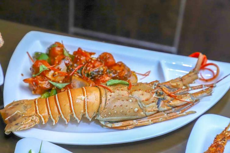 The mains include a range of dishes prepared in various styles, such as Steamed Pomfret with Mushroom Sauce, Shallow Fried Jumbo Prawn in Chef’s Special Sauce, Lobster with mint, lemon & Chilies or Thin Fried Squid in Toban Djan Sauce, to name a few.