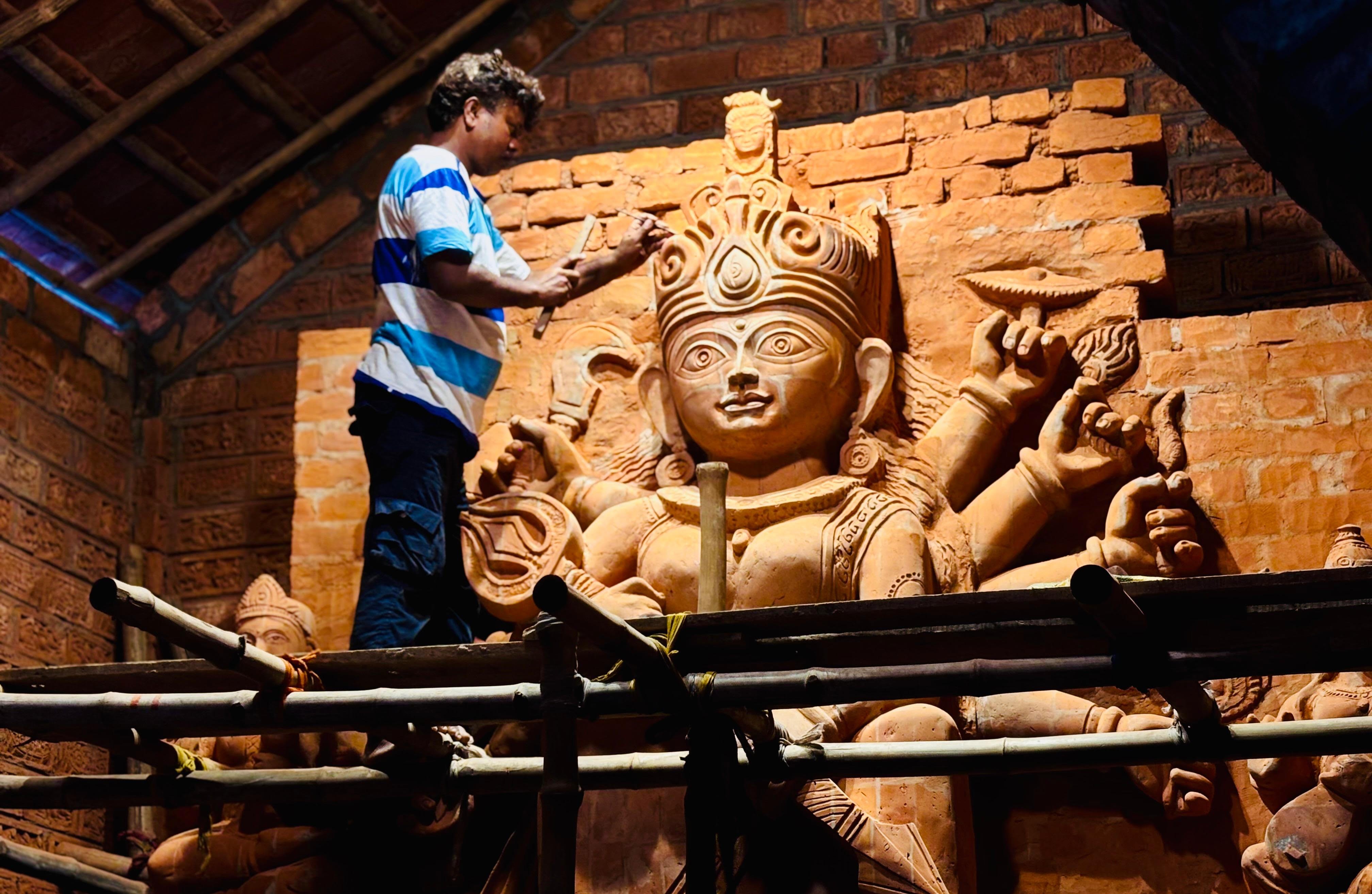 “She didn’t just slay Mahishasura,” said a young sculptor in Ghurni, giving final touches to a Durga statue. “She slays our despair, our fear, our silence.”