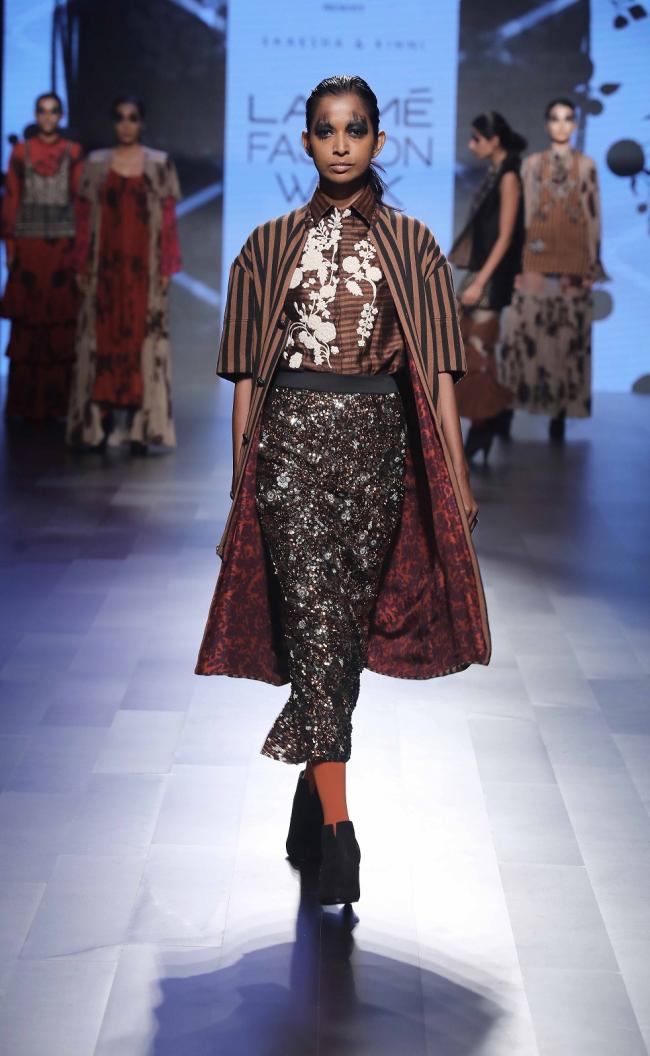 The deep red tiered frilled maxi with gold embroidered gilet, pleated bell-sleeved maxi and cover, striped jackets, black maxi with skirt with beaded tasseled blouse, the shimmering horizontal striped skirt with printed cover or the printed layered skirt with cropped blouse were superb additions in the presentation.