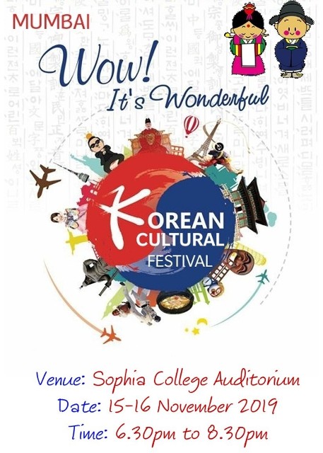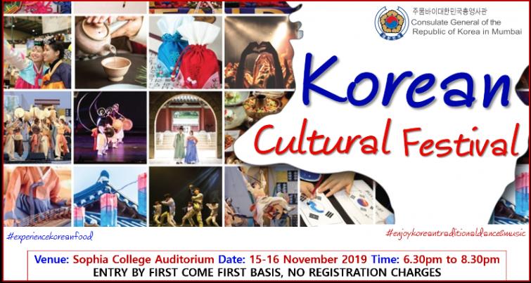 The Korean Cultural Festival will take place on November 15 and 16, 2019 at Mumbais Sophia Bhabha Auditorium between 6.30pm and 8.30pm both days.