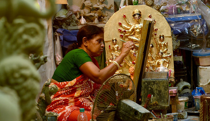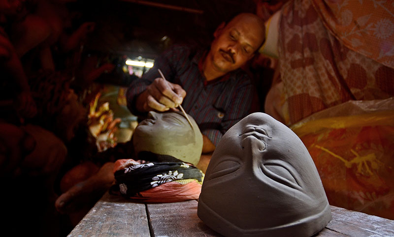 In the warrens of Kolkata's clay artists' colony Kumartuli, the idols of goddess Durga with ten splayed arms and three observant eyes, are getting final touches in the second year of a global pandemic. IBNS writer Debayani Bose marvels at the defiance of the potters to disease and universal budget crunch as they mold the lumps of clay into paragons of divinity