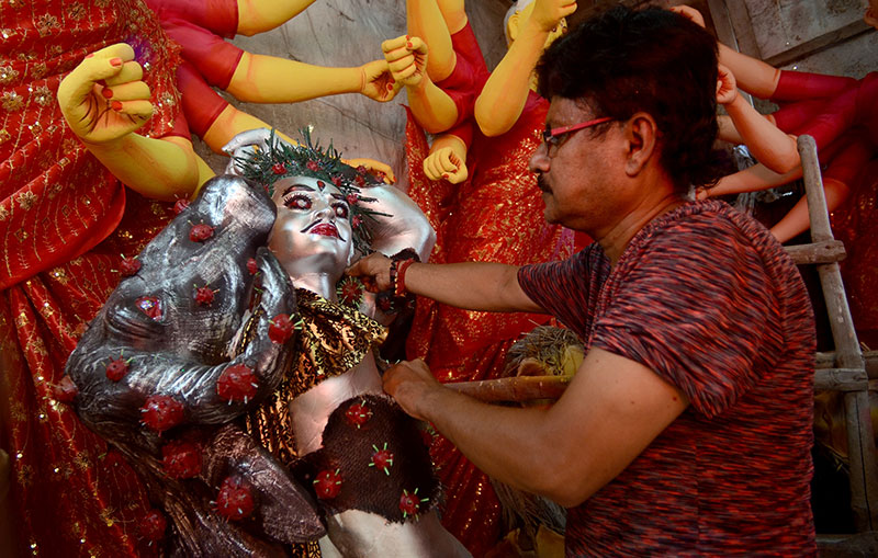 The tradition of uttering the Durga name comes from a sense of invoking the protective blessing of the goddess where Maa Durga and her children are considered family. Well, people need it more than ever since the deadly coronavirus struck early last year. So the asura (the demon Ma Durga slays) is themed as "Deltasur" (the more deadly Delta variant of coronavirus) this year in Kumartuli.