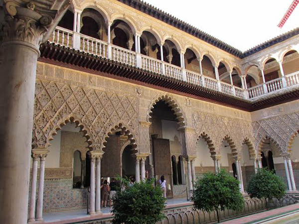 Mudejar art of decoration lays special emphasis on the techo artesonado, or ornately decorated coffered wooden ceiling. The spaces within the beams were covered with wood carvings, using geometric designs and plant motifs, or calligraphy. One of the finest examples, experts say, is this palace in Seville.