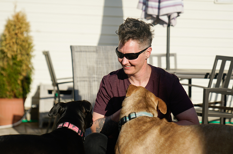 Rebecca Welly feeds her dogs (River and Forest), treats on Monday, April 10, 2023, at her home in Columbia. Welly is the founder of start-up Dog Wild, which won third-place at Missouri start-up weekend. (Photo by Lucas Owens)