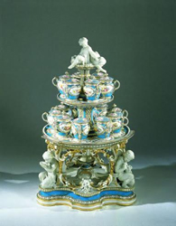 his Meissen service made around 1775 is striking for its exquisite floral painting. The shapes of the individual pieces are good examples of “Baroque Classicism”. The perforated fruit basket already displays elements of Classicism with its predilection for the formal repertoire of Antiquity.
