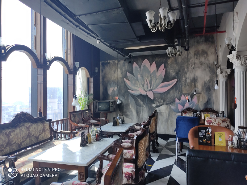 There’s a section where the opulence of a typical zamindar’s house is represented through the ornate-looking wrought iron chairs placed around a faux fountain. It captures the mood of a bygone era. An extension of this section has used sports chandeliers, ornamented lampshades, a gigantic lotus painting covering a wall, rich upholstery with floral motifs, and white pillars adding to the colonial feel. Black and white checkered tiled flooring, white and grey colours, vibrantly rich velvet curtains, wooden furniture with teak finish, unfinished walls and pink lotuses—have all combined to create an interior that boasts of a mix of conventional and unique décor elements.