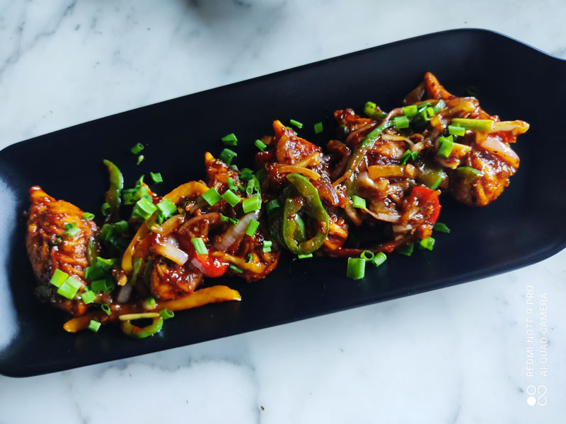 Try their Macaroni Pasta Salad, Kolkata Style Fish Finger(Betki), Mushroom and Cheddar Bruschetta, Crispy Sesame Honey Chilli Fries, Chilli chicken Kolkata style, Bharwan Aloo, Classic Chicken Burger, Slice Chicken in Lemon Garlic Sauce with Chilli Garlic Noodles—but this is not the complete menu, of course! You ought to pay a visit to explore the culinary delights on offer! I sampled a variety–Ajwaini Fish Tikka, Pan Fried Momos, Stuffed Grilled Chicken, Cheesy-dar Garlic Bread and the one which actually satisfied my taste bud was the Chicken Spring Rolls! It was perfectly done—crispy with generous chicken filling. The Cheesy-dar Garlic Bread lacked the ‘garlic’ flavour. Ajwaini Fish Tikka, Pan Fried Momos came overtly spiced with masalas and sauces respectively. I loved the Stuffed Grilled Chicken with its green peas and cheese stuffing!