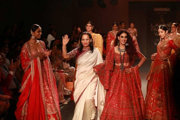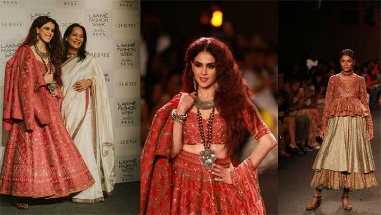 Kolkata, Aug 28 (IBNS): Spectators at the Lakme Fashion Week 2019 gave a rousing welcome to model and actor Genelia Deshmukh as she returned to the ramp after a hiatus of five years, attired in a Saroj Jalan created bright red hand-embroidered lehenga and choli, which she later teamed with a contemporary jacket.