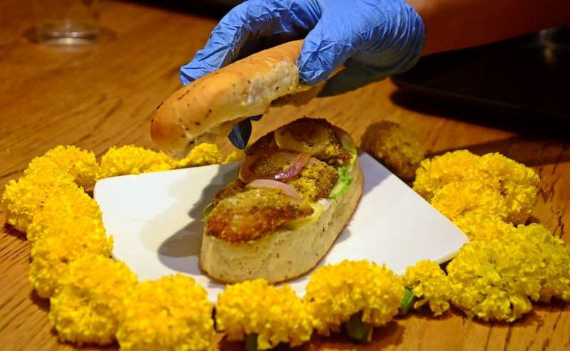 Highlights from the menu include Chingri Turnover (where the golden brown pastry was filled with spiced prawn or ‘chingri’ stuffing and topped with black sesame seeds), Bhetki Bhaja Sandwich (fried ‘bhetki’ fish, layered with ‘shorshe’ or mustard mayonnaise, fresh vegetables and lettuce, and served in mustard panini bread), Aloo Posto Burger (crumb-fried patty made with lightly spiced potatoes and poppy seeds, paired with fresh vegetables, and served in a poppy seed-topped bun), Mihidana Brulee (a fusion of sweet ‘mihidana’ and brulee, made with thickened milk and finished with a caramelized sugar top, saffron strands, and pistachio).