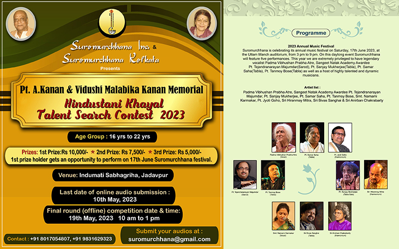 Prior to the June event, on May 19 this year, Suromurchhana will be hosting a music competition (at Indumati Sabhagriha, Kolkata); the topper – winner of the 'Pt A Kanan & Bidushi Malabika Kanan Memorial Award' – will get a chance to perform at the festival.