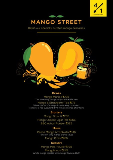 Come let’s explore ‘Mango Street’ with its delightful twists and turns c/o Café 4/1! Open yourselves to an experimental journey where mangoes take you on a delectable culinary tour. Well ‘Mango Street’ is…and surely you may have guessed…an innovative festival of mango treats—Mango Galouti, Mango Cheese Cigar Rolls, Penne Mango Arrabbiata and Mango Pizza.