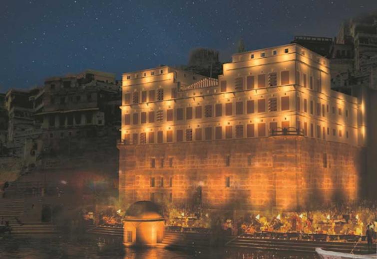 Since 1735, pilgrims have travelled from all over India to Varanasi to visit an expansive and striking stone staircase, stretching downward from the banks of the Ganges river to the water’s edge, as well as to experience the ornate and imposing palace that reaches skyward from the staircase’s top.