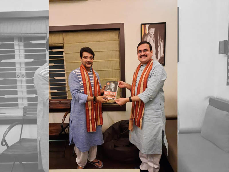 Anirban Ganguly presenting his book to Prosenjit Chatterjee (Image Credit: BJP)
