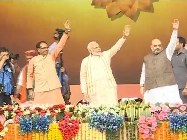 Shah is accompanied by Prime Minister Narendra Modi and Madhya Pradesh Chief Minister Shivraj Singh Chouhan at the mega rally in the state, where elections are due at the end of the year.