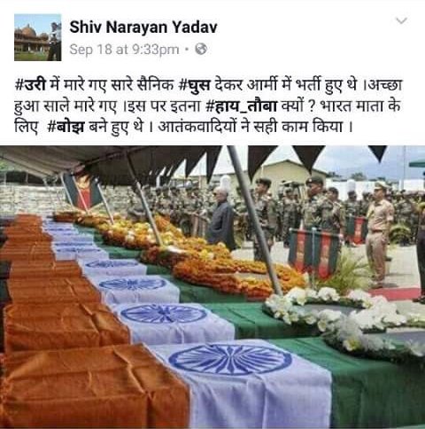 Shiv Narayan Yadav, who claimed to be a RJD leader, blamed the killing of soldiers in Uri terrorist attack on their “illegal appointments” in the Army, while expressing happiness over their supreme sacrifice. He added the “terrorists did the right thing by eliminating them”.