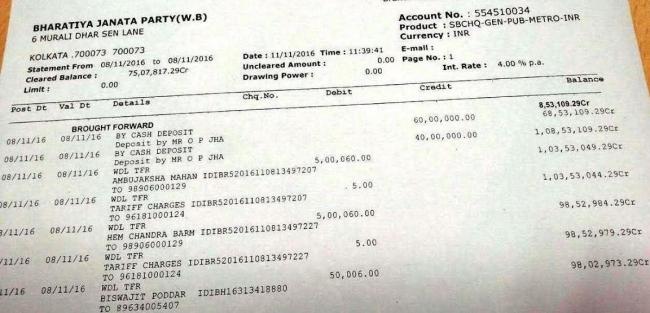 “On the day of the announcement of the decision on demonetisation i.e. 8th November, a sum of Rs1 crore (Rs 10 million) was deposited in a Kolkatta Bank in BJP's Account No. 554510034 on 8th November, 2016 in the denomination of Rs500/Rs1000,” the party alleged.