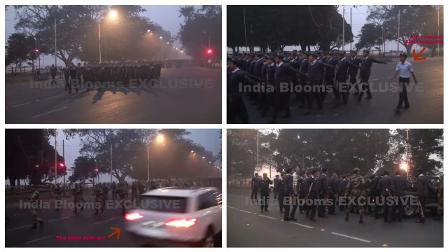 Kolkata, Jan 16 (IBNS) These exclusive CCTV images show how a speeding Audi driven by an alleged ruling TMC party leader's son hit AIF corporal Abhimanyu Gaud, while he was rehearsing for R-Day parade on Wednesday early morning in Kolkata's Red Road (Indira Gandhi Sarani).