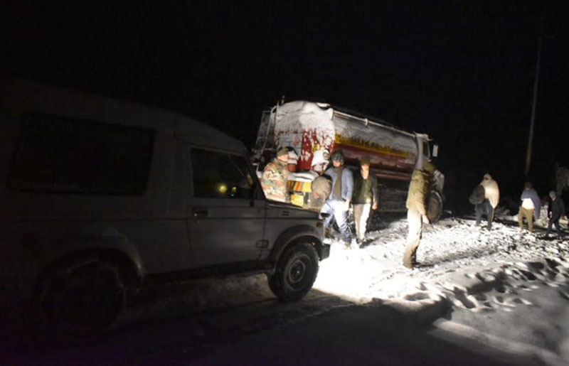 The troops of Indian Army carried out night evacuation of five persons including drivers and co passengers of three trucks, stuck in heavy snow in the remote area between Samdong and Lachen, North Sikkim on Jan 29 night.