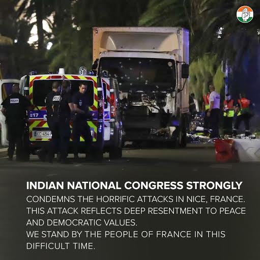 In a statement released by the party, it said, "Indian National Congress condemns the horrific attacks in Nice, France. This attack reflects deep resentment to peace and democratic values. We stand by the people of France in this difficult time."