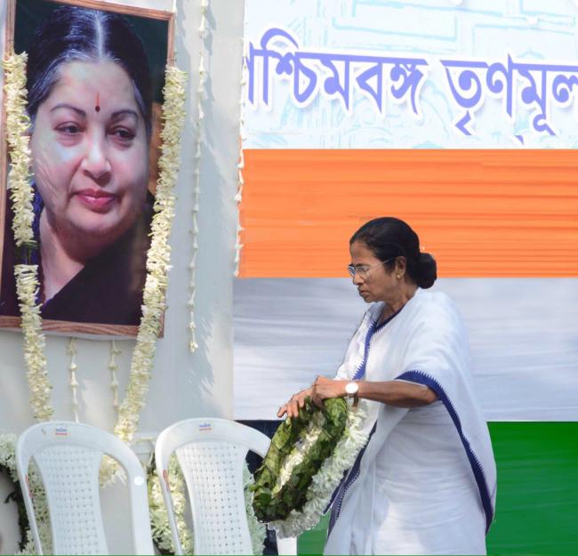"On behalf of @AITCofficial,I paid floral tributes on the portrait of late Jayalalithaa ji in our "Sanhati Dibas" programme today," Banerjee tweeted.
