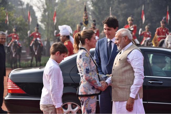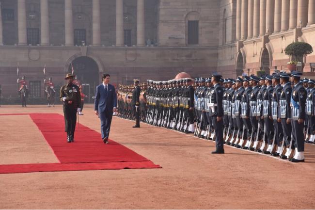 A ceremonial welcome was given to the Canadian leader who is on a week-long visit to India.