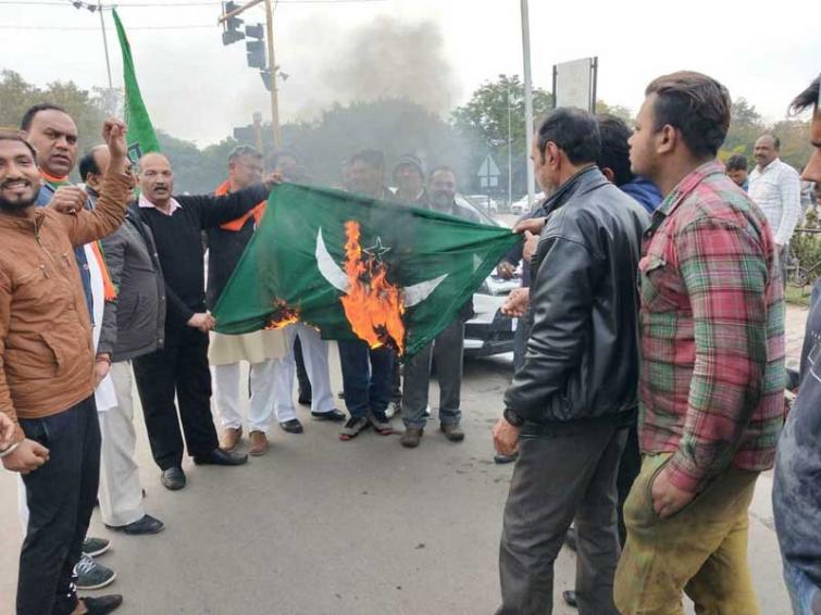 Protesters expressed anger about the neighboring country, which is accused of harbouring Jaish-E-Mohammad, the terror outfit which has claimed the responsibility for the ghastly attack, by burning Pakistani flags.
