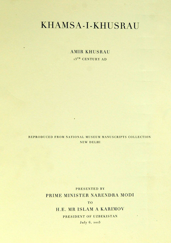 New Delhi, July 6 (IBNS) Prime Minister Narendra Modi on Monday presented President Islam Karimov a specially commissioned reproduction of Khamsa-i-Khusrau by the great 13th century sufi poet Amir Khusrau who was born in Uttar Pradesh and whose father hailed from Uzbekistan.