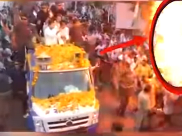 Gandhi, who was traveling on an open jeep, escaped unhurt.
