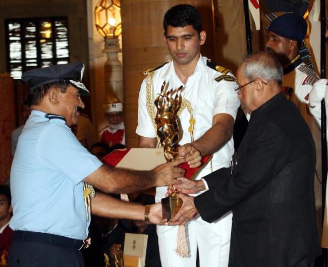 Air Marshal MK Malik AVSM VSM Air Officer-in-charge Administration who is also the Vice Chairman of ‘Subroto Mukerjee Sports Education Society’ received the ‘Rashtriya Khel Protsahan Puruskar’ on behalf of ‘Subroto Mukherjee Sports Education Society’ from President of India on Monday at a ceremony in Rastrapati Bhawan.