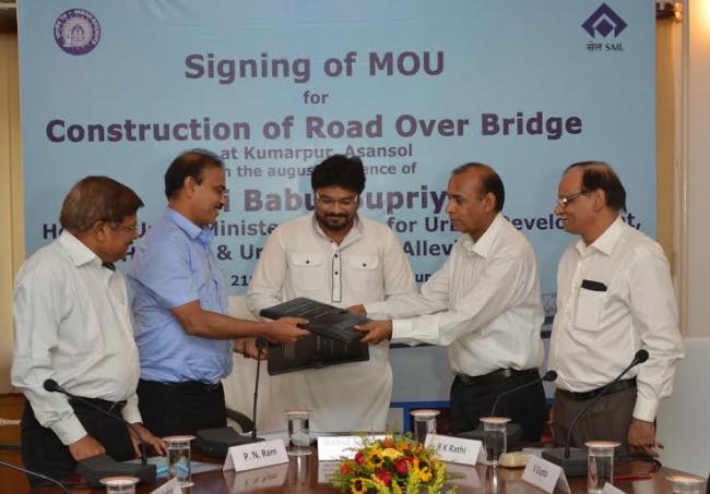 Manas Sarkar, Chief Engineer (CON-II), Eastern Railways and Vivek Gupta. GM (Projects), SAIL-ISP signed the Memorandum of Understanding (MoU) on Saturday on behalf of their respective organisations, in the presence of Babul Supriyo, Union Minister of State for Urban Development, Housing and Urban Poverty Alleviation, who laid the foundation stone of the over-bridge.
