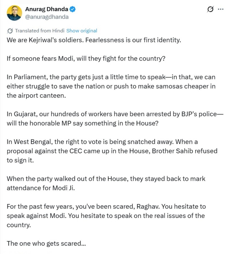 Responding to the video, AAP national media chief Anurag Dhanda accused Chadha of avoiding criticism of Prime Minister Narendra Modi and failing to raise key national concerns in Parliament.